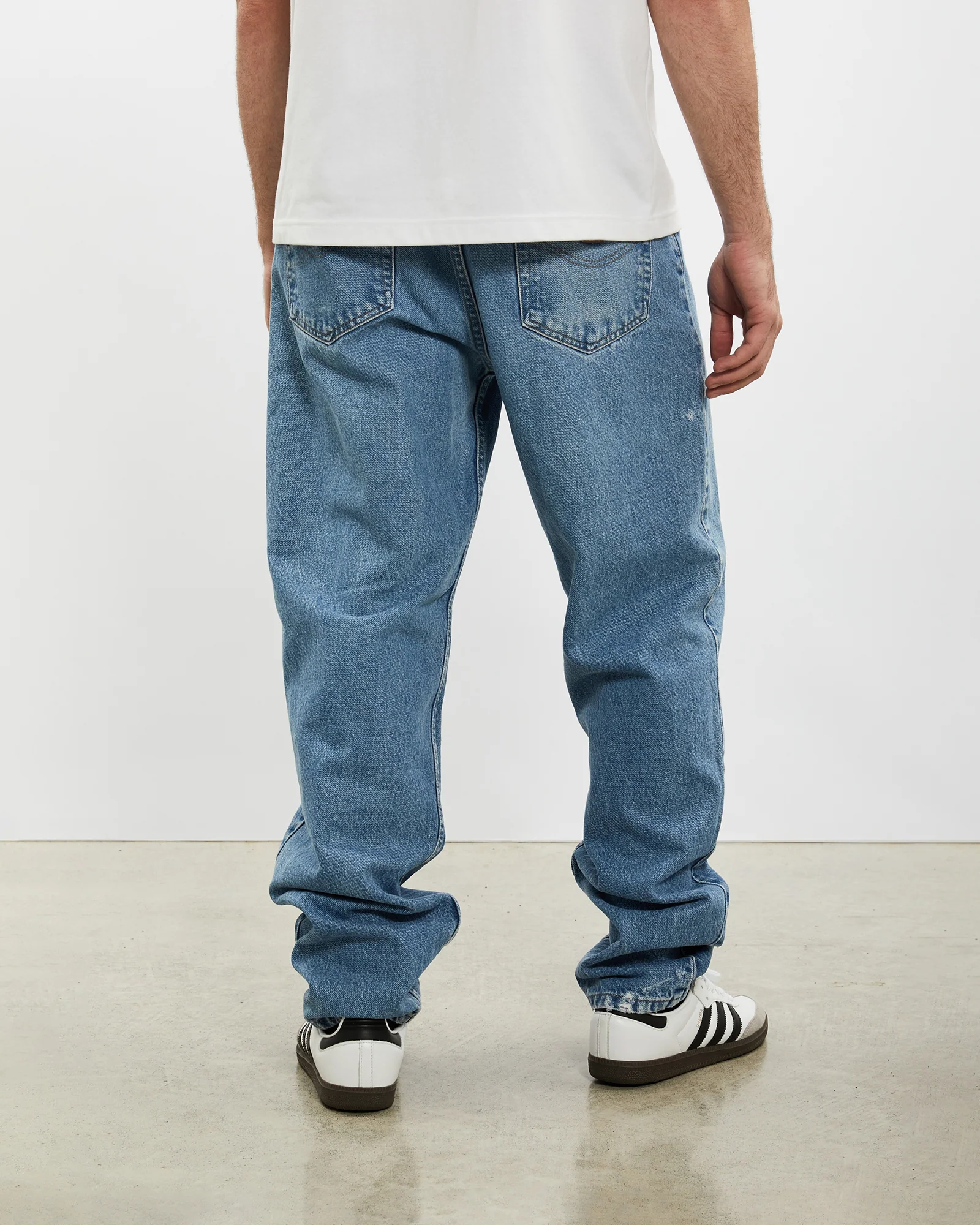 Small marks and distressing on both legs. Heavy distressing on back of right hem