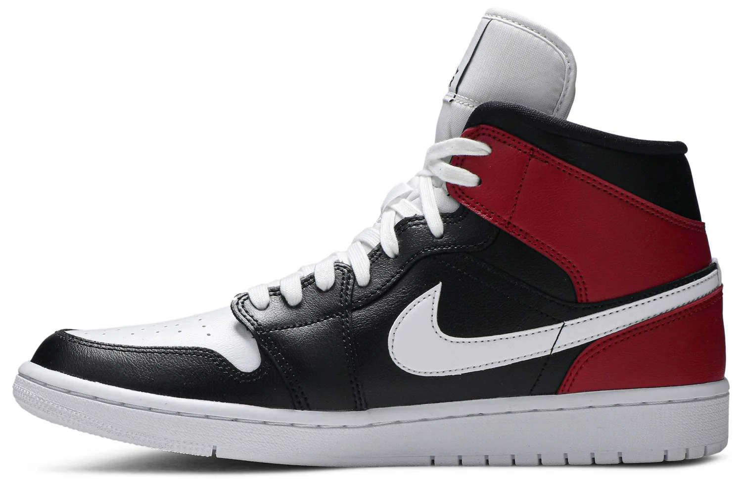 The Jordan 1 Mid Black Noble Red (W) features a black, red, and white leather upper. From there, white Nike "Swoosh" logos adorn the sides and black "Air Jordan" badges or Jumpman logos, set against crimson Noble Red, complete the design.